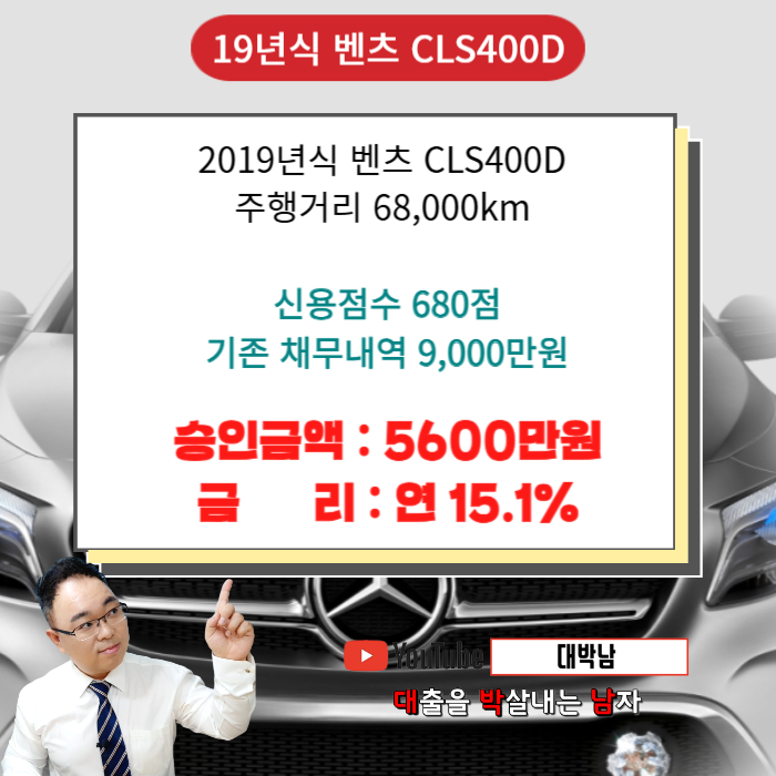 고객님께서 소유하신 19년식 벤츠 CLS400D(주행거리 약 6만8천km)를 담보로 오토론 가조회 요청을 해드렸습니다. 여러 군데에서 채무 과다로 거절된 가운데, 한 금융사는 고객님의 소득증빙을 통해 한도를 5,600만 원까지 상향 조정해 승인해주었습니다.